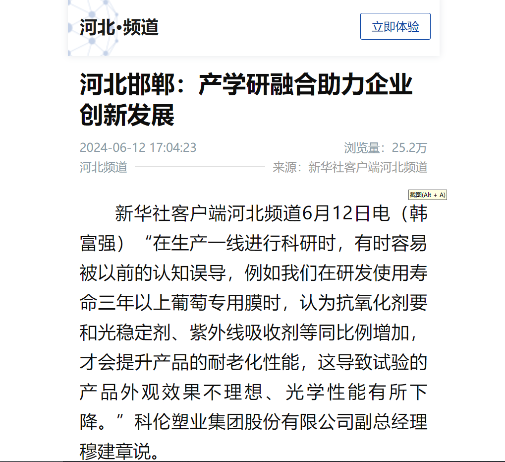 科倫塑業(yè)集團股份有限公司于2024年6月12日就公司成長歷程、產(chǎn)學研融合助力企業(yè)創(chuàng)新發(fā)展方面,公司副總經(jīng)理穆建章接受新華社河北分社采訪,報道詳情如下
